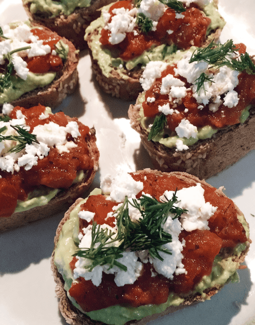 Bruschetta with avocado paste, tomatoes and feta cheese