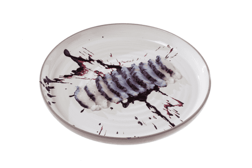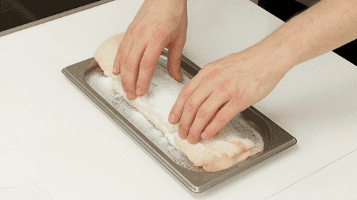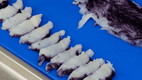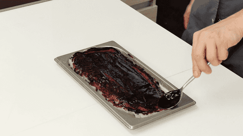 Rub the fish with berry puree on one side, cover with plastic wrap, and refrigerate for 12 hours. The time can vary: it depends on how intense the color needs to be. But if the fish is left in the puree too long, it may color the whole piece, and the idea is for the pattern given by the berry juice to resemble the northern lights.