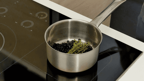 Place the blueberries in a saucepan, add thyme, rosemary, and juniper, and heat everything over medium heat until reduced to a medium thickness. Then blend with a blender, strain through a sieve, and cool.