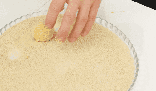 Then in beaten eggs and breadcrumbs.