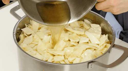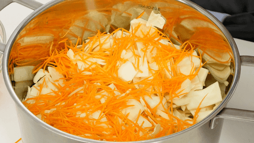 Layer the vegetables in the pot, starting with carrots and garlic, and finishing with cabbage.