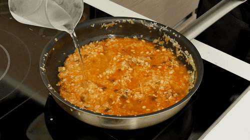 Add washed rice, raisins, chopped or grated tomato and tomato paste, pour in a glass of water. Add spices, salt and pepper, mix well, cover with a lid and simmer on low heat for 15 minutes until the rice absorbs all the water. At this stage, the rice should be al dente. Remove from heat and let cool.