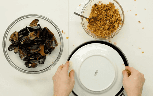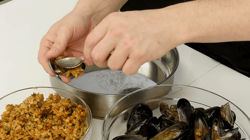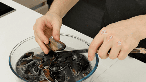 Mussels should be thoroughly washed and freed from beards. Then place them in warm water to open up, cutting the meat from one shell so that it remains attached to only one shell.