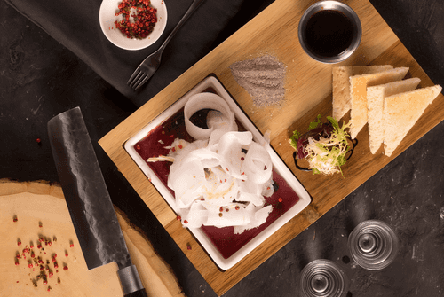 Sliced small-eyed macrurus is a true delicacy of the Russian North, combining the freshness of the sea breeze and the richness of nature's flavors. This preparation method originated among the peoples of Siberia and the Far East, allowing one to enjoy thin icy layers of fish in its pure form. Macrurus, with its delicate and slightly sweet taste, is perfect for slicing. The harmony of the dish is achieved through a combination of crispy croutons, aromatic oyster sauce, and a spicy mix of salt and pepper that highlights the fish's natural freshness. Slices are eaten immediately after cutting while they remain icy and crunchy, with each piece literally melting in your mouth and leaving an unforgettable aftertaste. It is not just a dish — it is a ritual of respect for nature's gifts and the traditions of northern peoples.