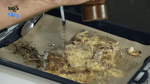 Place the meat on a baking tray, salt it, spread mustard over the entire surface, and pepper it. Add 4 cloves of roughly chopped garlic on top of the meat, herbs from the pan, and a bit more fresh rosemary leaves.