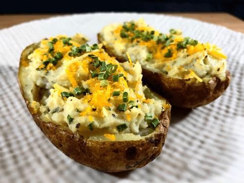Cut the cooked potatoes in half and scoop out the potato flesh almost to the skin. Place the potato boats back on the baking sheet, drizzle with olive oil, and bake for 15 minutes at 180 degrees.