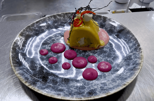 After cooling the puree, spread it on a film greased with sunflower oil. Spread the puree in an even layer. Place the filling on top, then add diced avocado and roll it up using the film. Cut the roll into portioned pieces. Serve with beet sauce.