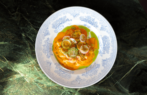 First, make the aguachile sauce. Blend all ingredients except for the sea bass until smooth. You will need 100 grams of sauce per serving.