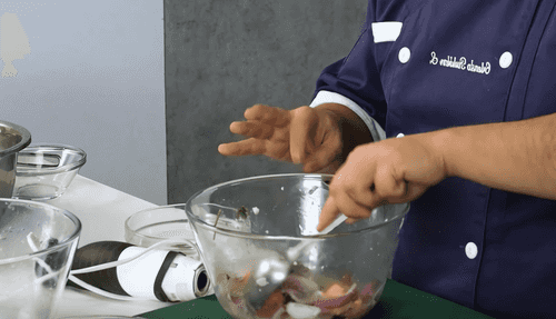 Add 150 ml of water and a few ice cubes to the vegetables, blend until smooth, season with salt to taste, and strain through a sieve. This is called 'tiger milk'.