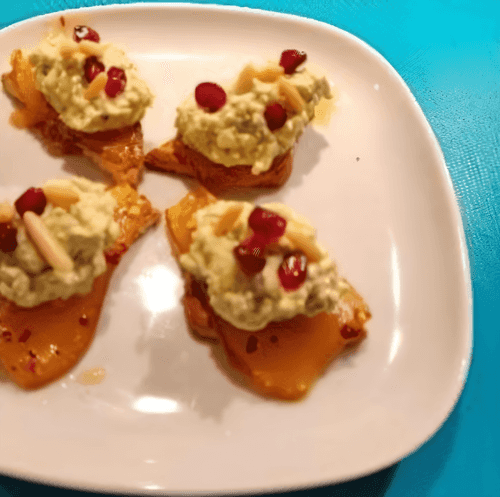 Sweet and spicy snack with cottage cheese, avocado and caramelized pear