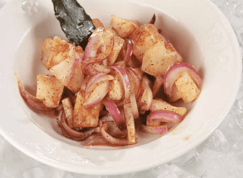 Combine the fish with onion, season with salt, black pepper, olive oil, add bay leaf, mix well and place in the refrigerator to marinate for 15 minutes. During this time, the fish absorbs the oil, salt, pepper and onion juice - becoming marinated. At the same time, the fish slowly thaws so that the outside becomes soft while the inside remains frozen. In this form, the dish is ready to eat.