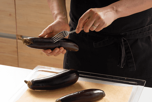 Prick the eggplants with a fork and bake in an oven preheated to 220 degrees for 20-30 minutes.