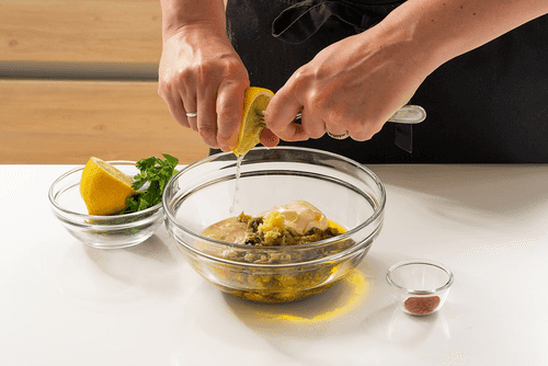 Add two heaping tablespoons of tahini, mayonnaise, minced garlic, olive oil, the juice of one lemon, and salt to the eggplants. Mix well.