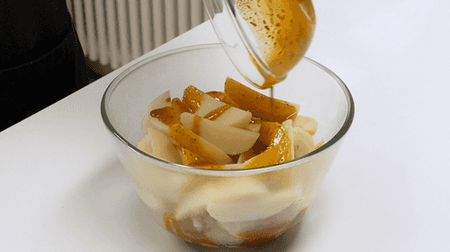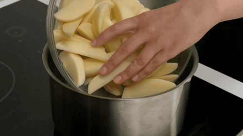 Peel the potatoes, cut them into wedges, toss them into boiling water and cook for 3 minutes. Then drain the water and let the potatoes cool slightly.
