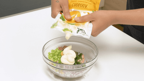 Cut the avocado in half, remove the pit, and fill the cavity with a generous mound on top.