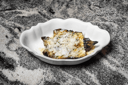Place the eggplant on a plate, cut it in half lengthwise and open it like a book. Make crisscross cuts in the flesh, drizzle with butter sauce, and sprinkle with bonito flakes and grated parmesan.