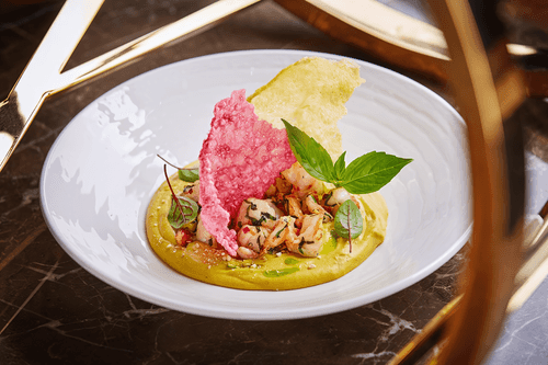 Recipe by Andrey Palesiki, chef of the restaurant "Erwin. Recamoreocean". Chickpeas, which are the main ingredient of hummus, are a bit dry on their own. Therefore, delicate sweet potato cream is the very addition to the dish that chickpeas themselves would like to ask for, if they could speak. In addition, sweet potatoes perfectly set off the sesame bitterness of tahini and serve as a favorable background for fried garlic shrimp, which also have sweet notes.