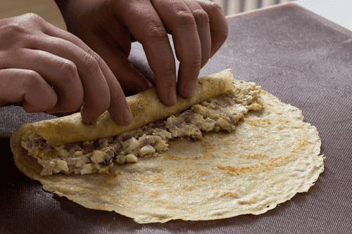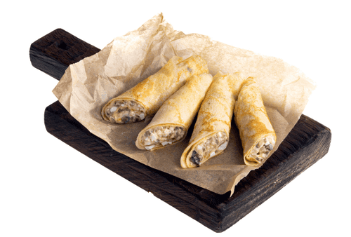 Spread the prepared forcemeat on half of the pancake and roll it up. Do the same with the remaining pancakes. Before serving, cut each roll in half, slightly diagonally.