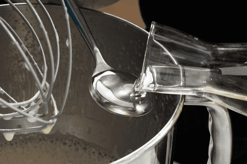 Pour boiling water into the eggs while continuing to whisk. The foam will double in size. Add 250 ml of cold milk, also without stopping the mixer.
