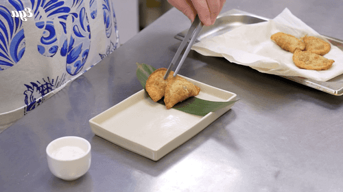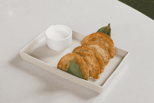 Cook in the oven on a rack for about 3-4 minutes at 180 degrees. Place the finished chebureks on a plate on a bamboo leaf. Serve yogurt separately in a sauceboat.