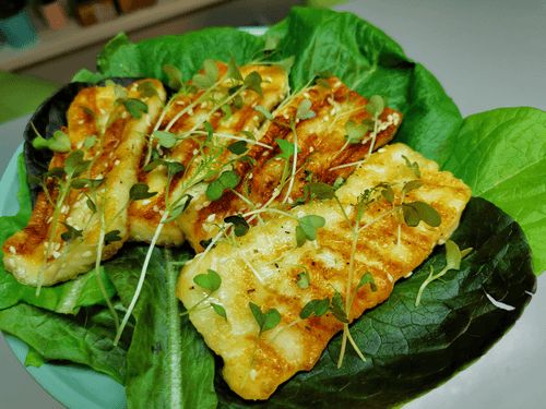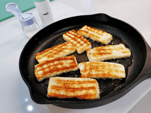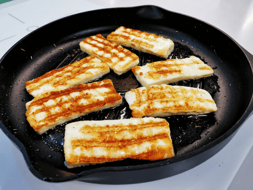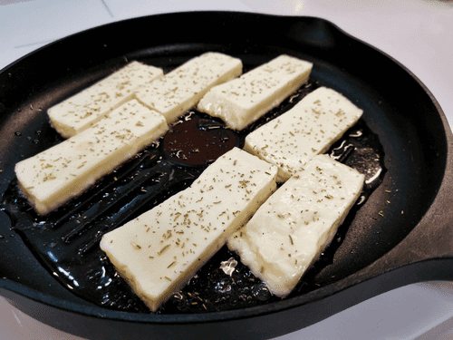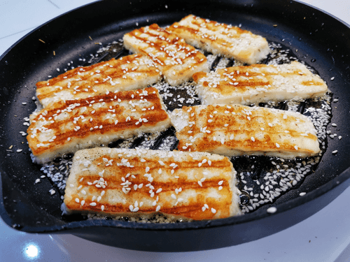 Сыр халуми – визитная карточка греческой кухни, известный своим упругим и нежным вкусом с легкой солоноватостью. Этот сыр обладает уникальной способностью не плавиться при жарке, а приобретать хрустящую золотистую корочку, сохраняя сочность внутри. Его готовят на раскаленной сковороде-гриль, приправляя ароматными пряными травами, солью и перцем, чтобы подчеркнуть его природную насыщенность. Белые кунжутные семечки добавляют тонкие ореховые нотки, создавая восхитительное сочетание вкусов. В Греции халуми часто подают с медом, свежими овощами или оливками, превращая его в идеальное блюдо для завтрака или закуски. Наследие средиземноморской кухни в каждом кусочке – хрустящий снаружи, нежный внутри, халуми пробуждает аппетит и переносит в солнечные улицы греческих островов.