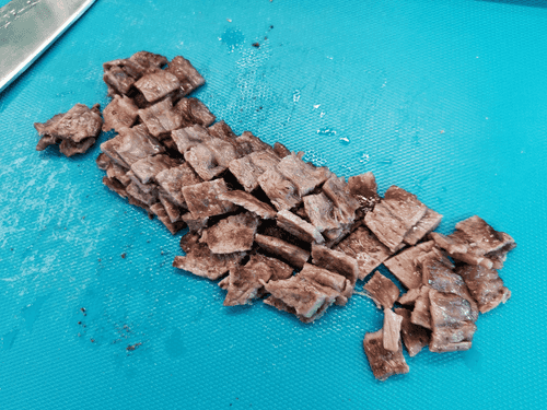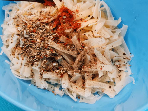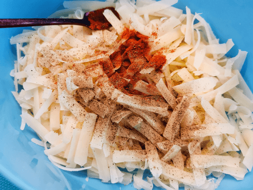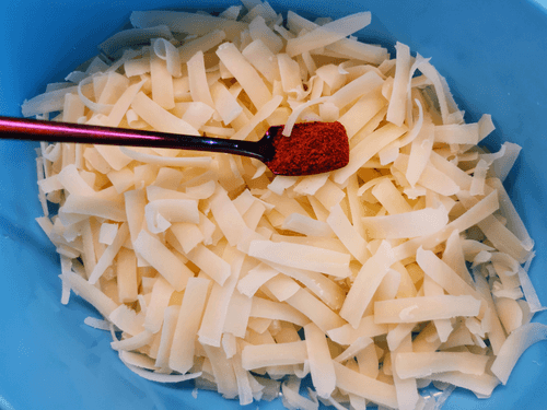 Scoop out cheese 'mounds' onto a baking sheet and add bacon on top.