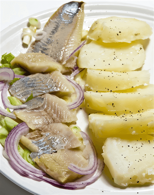 Herring with potatoes and butter is a traditional dish of Norwegian cuisine, rooted in the simple and hearty recipes of northern fishermen. The combination of salted herring, tender boiled potatoes, and creamy butter creates a harmony of flavors: the rich and slightly spicy taste of the fish is softened by the warmth of the potatoes and buttery tenderness. This dish is not only nutritious but also easy to prepare, remaining popular at both home dinners and festive tables. It is perfect as a standalone dinner or as an appetizer for traditional drinks from northern countries. Herring is a source of healthy fatty acids, while potatoes provide energy, making the dish balanced and beneficial. The simple yet elegant taste of this combination remains a favorite in Norway and far beyond its borders.