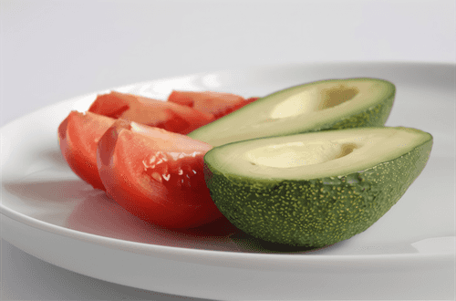 Drizzle avocado slices with lemon juice, season with salt and pepper, and place a slice of tomato on each piece.