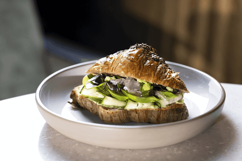 A game of a trendy big green salad - avocado, seaweed, cucumber and edamame beans are packed into a croissant. This healthy company doesn't need any dressings, but if you want, you can sprinkle everything with lemon. Recipe from Dmitry Pogorelov, chef of the gastropub "Kotelnaya.