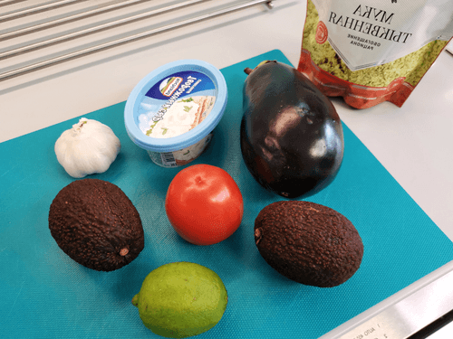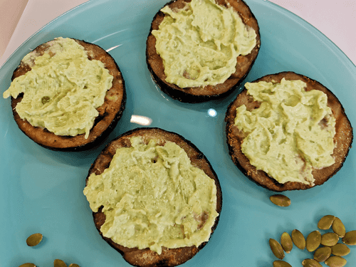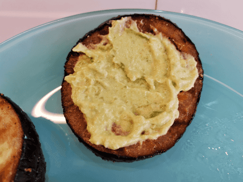 Grease the eggplant with avocado filling.
