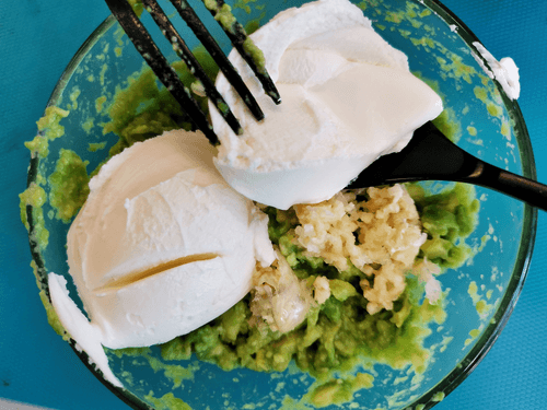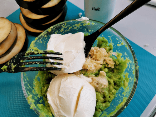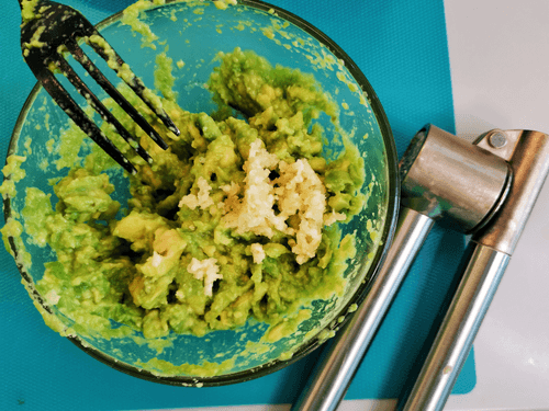 Use a press to squeeze garlic into a bowl with avocado.