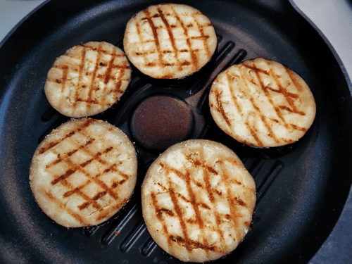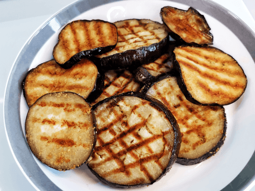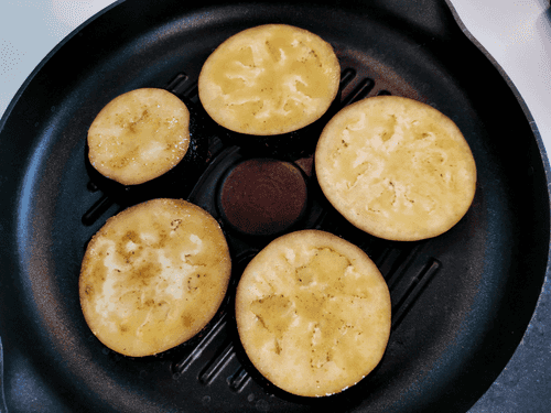 Coat the eggplant in oil and flour, then place it on a dry hot grill pan.