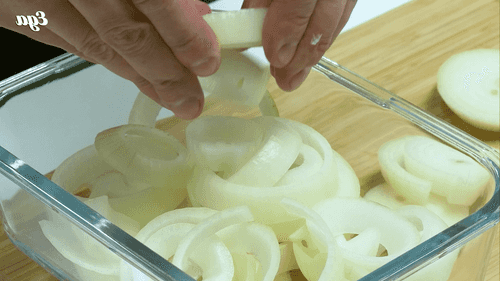 Peel the onion and cut it into thick rings.