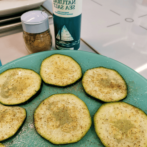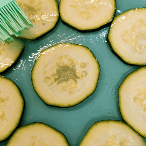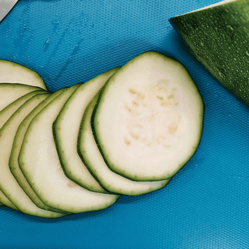 Slice the zucchini into thin rounds about 3 mm thick.