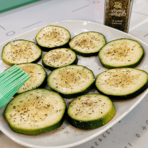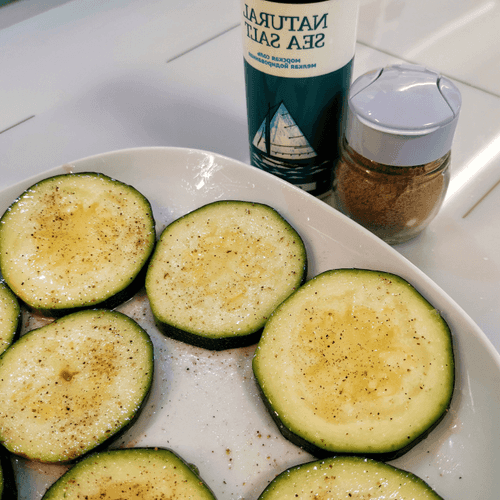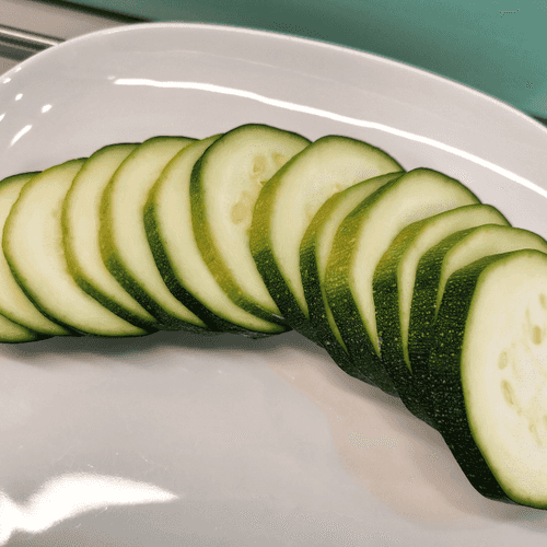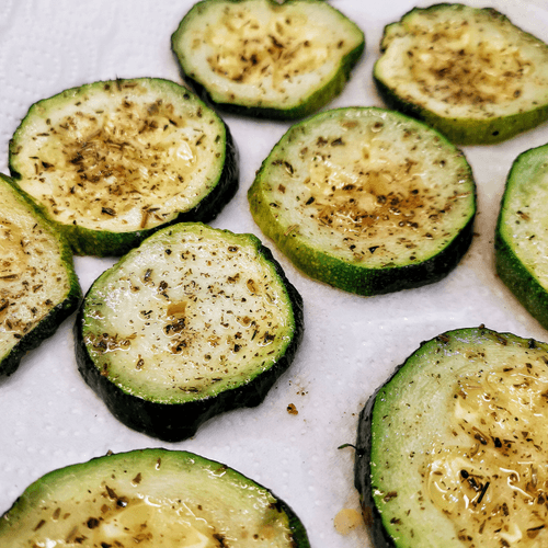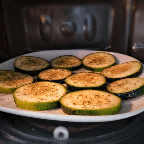 Send to the microwave for 8 minutes at maximum power. Time varies depending on the microwave characteristics. Zucchini should be softened to the center of the slice.