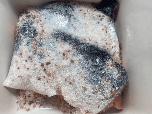 For salting, a deep dish is needed; sprinkle the salting mixture on the bottom, place the fish in the dish, and cover it with the mixture on top.