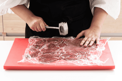 Place the meat between two layers of film and pound it very thin.