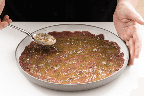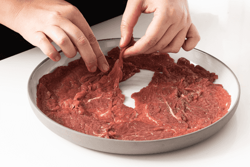Lay the meat in a single layer on a plate, trying to avoid gaps between the pieces.