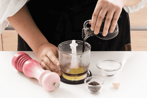 Blend olive oil, balsamic vinegar, rosemary, garlic, salt, and pepper.