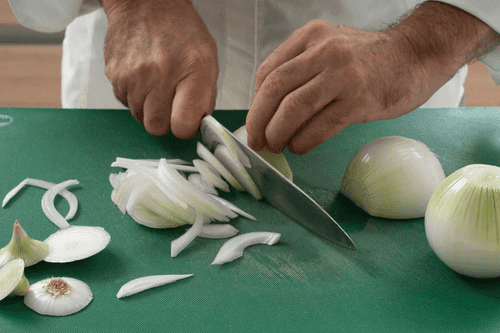 While the oil is heating, slice the onion into thin strips.