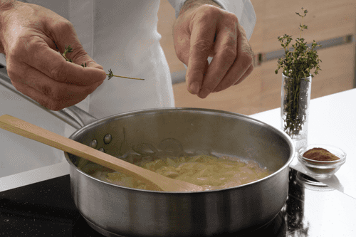 Add thyme leaves and 1-2 pinches of cinnamon, simmer until caramel color.