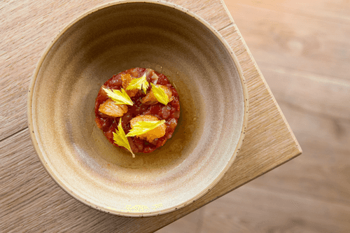 Cut the tuna fillet, fresh and dried tomatoes into cubes. Mix with tomato sauce and kimchi dressing.
