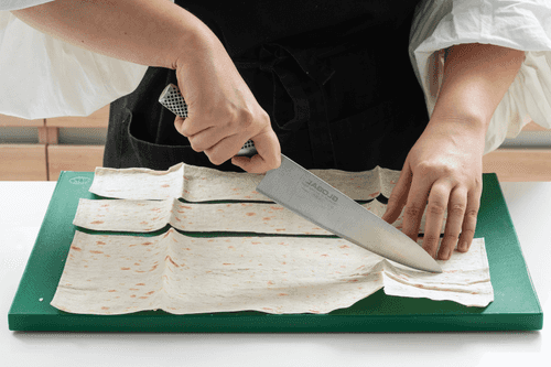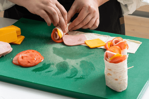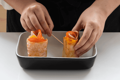 Lay pieces of cheese, tomato, and ham on ribbons alternately and roll them up to create 'roses'. If the roses unravel, they can be secured with a toothpick, but remember to remove it later.