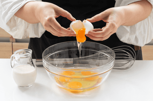 Crack the eggs into a bowl, add milk, salt and mix well with a whisk (do not beat!).