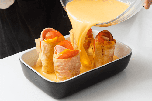 Take a high baking dish and grease it well with soft butter. Place the roses in it with the cut side up (remove toothpicks if used).