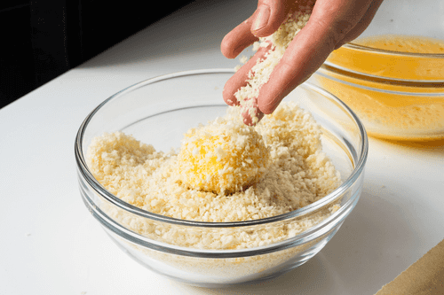 Coat the cooled balls in crushed breadcrumbs, then in beaten egg, and again in breadcrumbs.