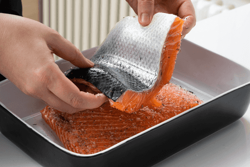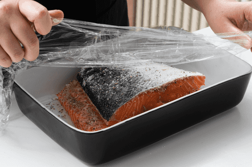 Pour 0.5 tablespoon of dry mixture at the bottom of a pot or other suitable container. Place the fish on top with the fillet side up.