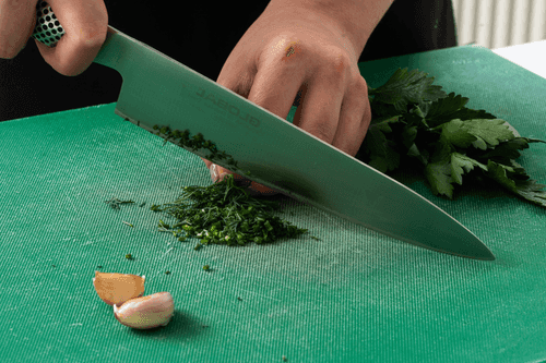 For the sauce, finely chop pickled cucumbers, garlic, and dill, and mix with mayonnaise.