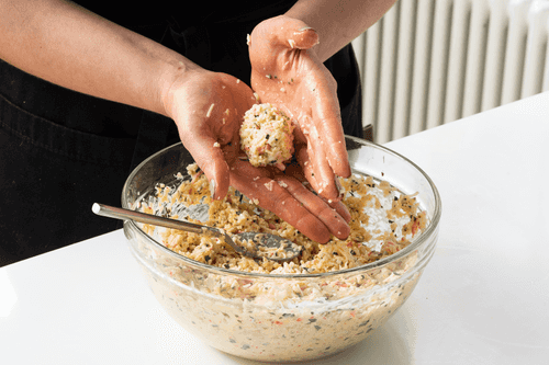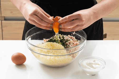 Mix crab sticks, grated cheese (200 g), parsley, garlic, sour cream, and eggs in a bowl. Add salt and pepper.