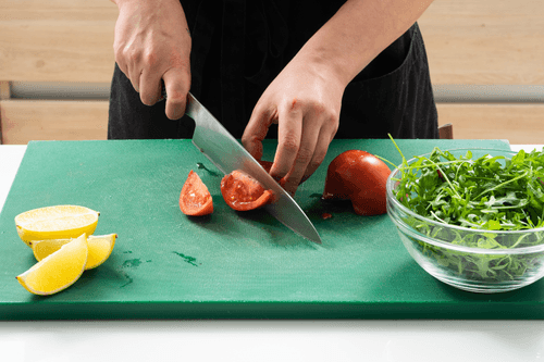 Chop the tomatoes coarsely and mix with the salad leaves. Dress with olive oil, drizzle with lemon juice, and season with salt and pepper.